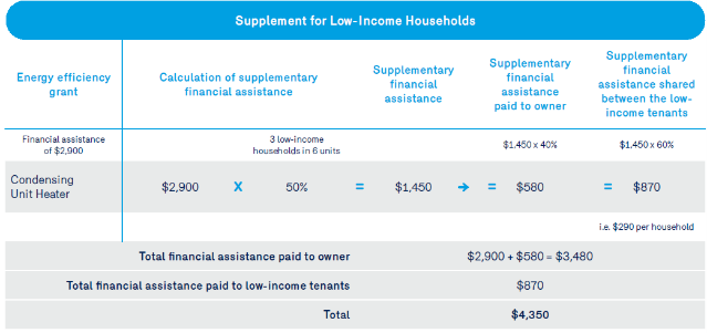 Example: The owner of a building with six units, three of which are occupied by low-income households, purchases a condensing unit heater for the building. He is entitled to a $2,900 grant for the purchase and installation of the unit heater, as well as the increased amount under the LIH program.