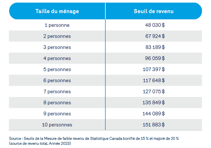 Pour être considéré comme un ménage à faible revenu, le revenu familial doit être égal ou inférieur au montant indiqué dans le tableau.